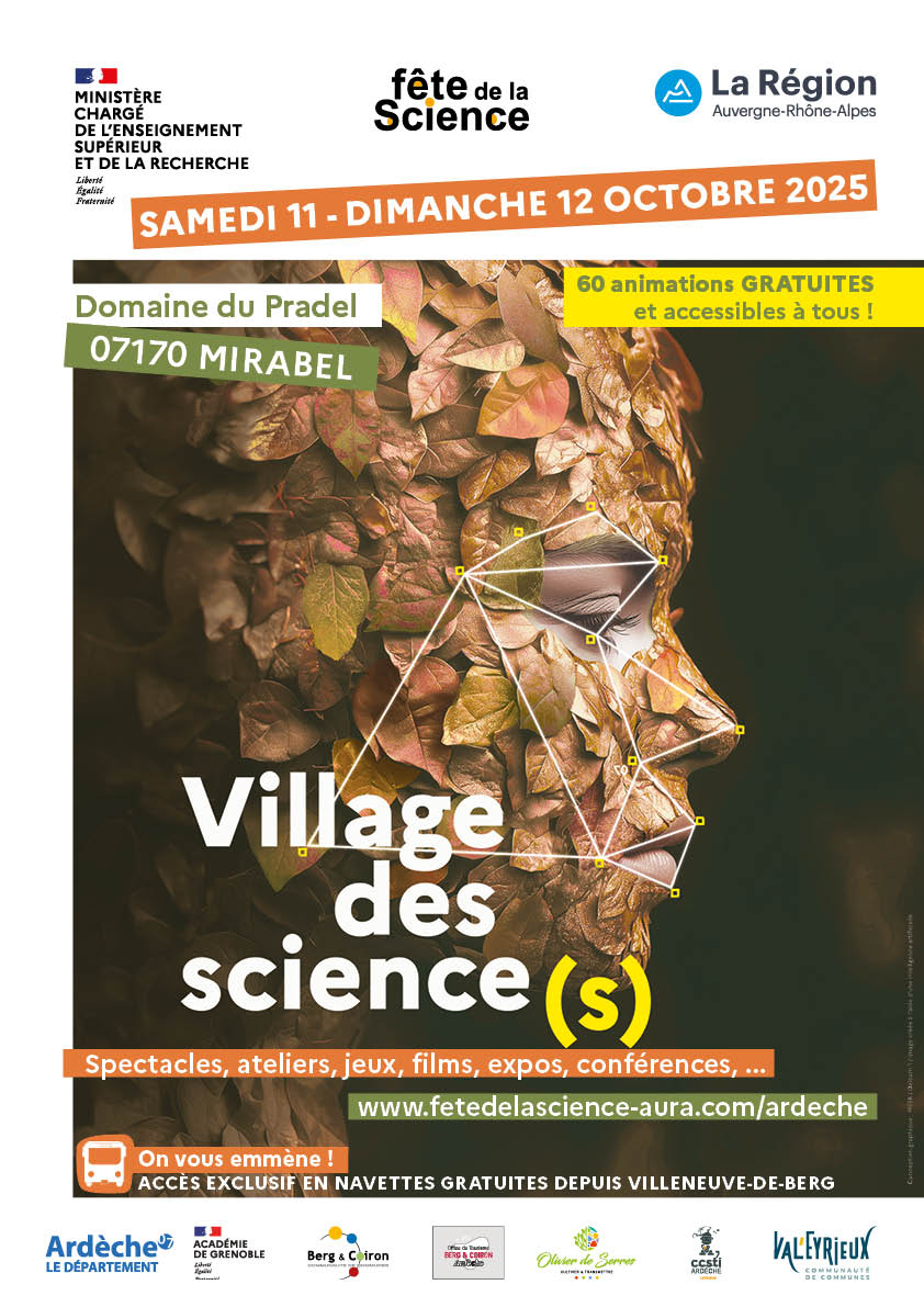 Stimuler la curiosité, éveiller les esprits, partager la connaissance. Voilà l’ambition renouvelée de la Fête de la science, qui, depuis plus de 35 ans, rapproche les citoyens de la recherche, de la découverte et du questionnement. En Ardèche, cette dynamique prend une ampleur remarquable : 4 semaines d’animations pendant lesquelles plus de 185 rendez-vous sont programmés dans 49 communes, 10 temps forts dont le Village des sciences itinérant, événement phare, accueilli cette année à Mirabel, sur le site du Pradel.