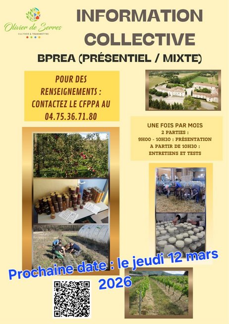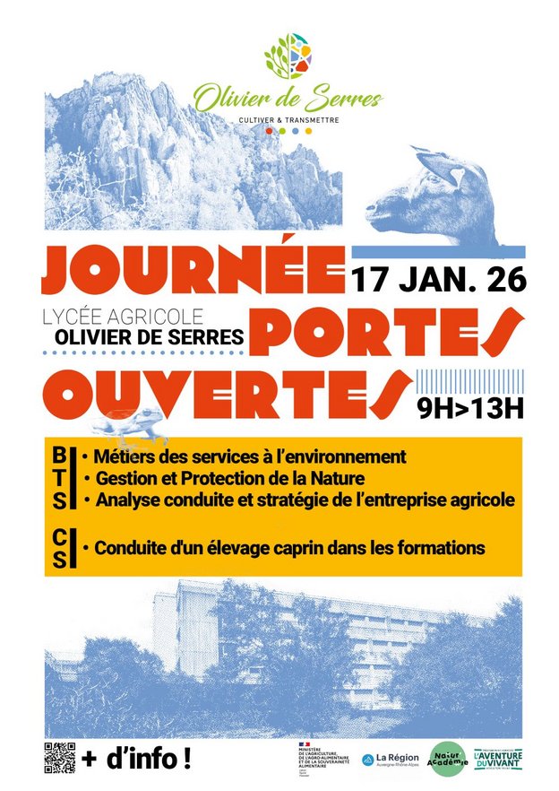 * Priorité Post Bac : le samedi 17 janvier 2026 de 9h00 à 13h00: sur le Domaine du Pradel (avec visite de l'exploitation) pour le CS Conduite d'un élevage caprin (apprentissage et formation continue) et au Lycée agricole d'Aubenas pour le BTS ACS'AGRI (apprentissage et formation initiale)