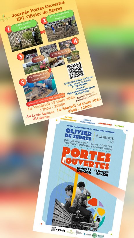 * Le vendredi 13 mars - 17h00 - 20h00 et le samedi 14 mars 2026 - 09h00 - 12h00 au lycée agricole d'Aubenas