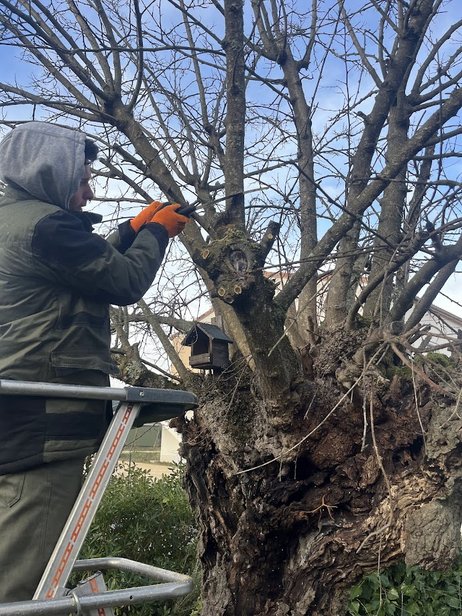 Le chantier a eu lieu le 8 janvier et le 21 janvier 2026, la taille de 3 mûriers a été réalisée à la scie arboricole et au sécateur de force. Les 2 autres mûriers ont des branches de diamètre trop important pour être taillés par les apprentis.