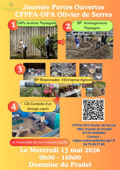 Le CFPPA-OFA Olivier de Serres, au Pradel en Ardèche, propose des formations aux porteurs de projets en milieu rural, en agriculture et en paysage. Les formations peuvent être d'initiation, techniques ou diplômantes.